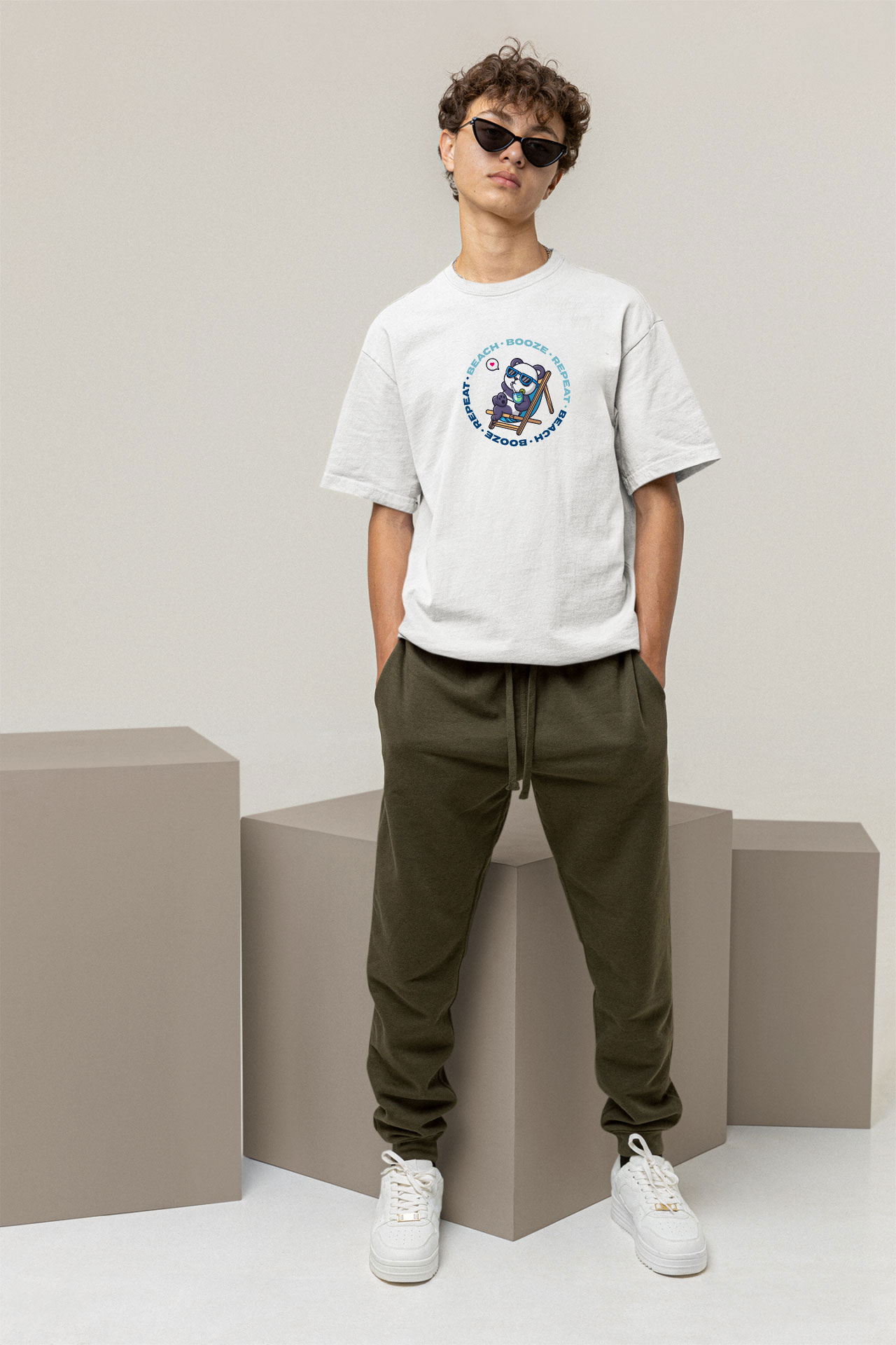Channel your inner beach bum with this ultra-chill oversized tee featuring the ultimate vacation mascot – a relaxed panda sprawled on a bench, drink in hand, soaking in the good life. With the mantra “Beach. Booze. Repeat.” stamped across the chest, this one’s made for those who know how to truly unwind.