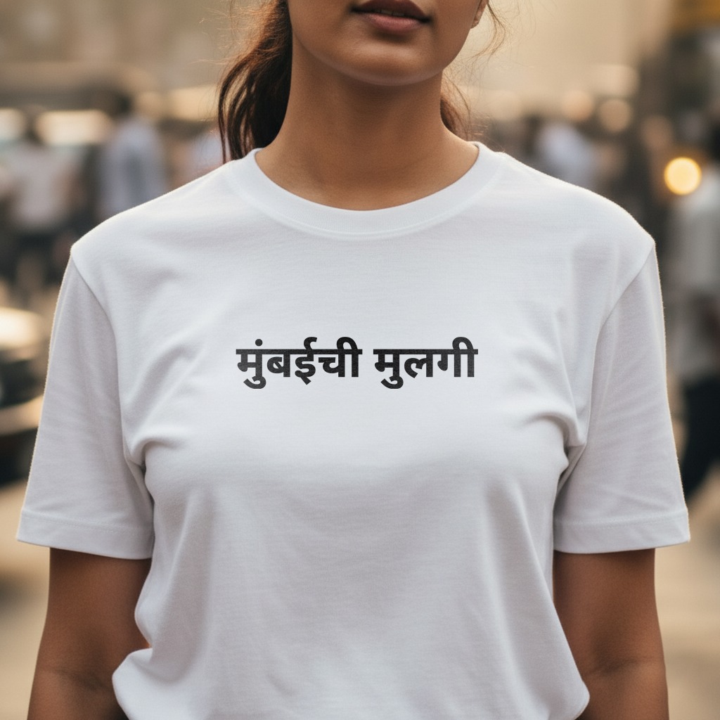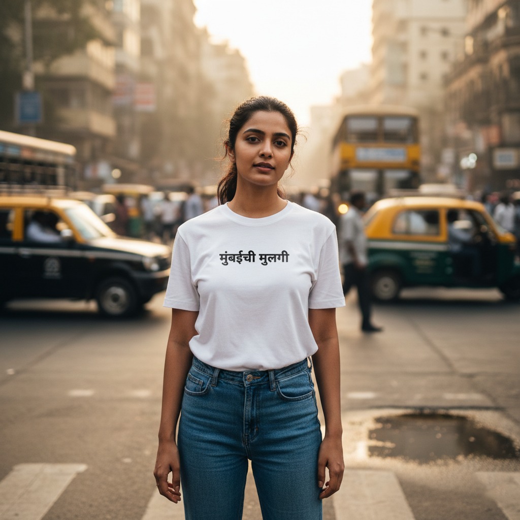 Our “मुंबईची मुलगी” T-shirt is a shoutout to every unstoppable, street-smart, vada-pav-powered girl who runs on Mumbai speed.